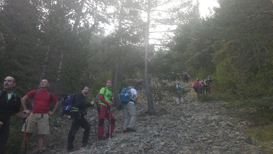 El bosque se abre, la senda también, cada vez mas piedras, lo que nos obliga a trazar lazadas sobre ella o recorrer pequeños tramos en diagonal. El desnivel acumulado es tan importante que echando la vistas atrás llegamos a observar Nocito, el barranco de la pillera ya queda oculto por las copas de los árboles. Una gran colada de piedras nos marcarán el camino que vamos superando en zig-zags para superar su verticalidad. Desaparecido el bosque las vistas del Tozal, que aparece y desaparece oculto por las nubes y niebla, son impresionantes, lo tendremos visible hasta que perdamos la verticalidad y nos adentremos de nuevo, al oeste, en una zona boscosa paralela a la pedrera. Será después de almorzar.